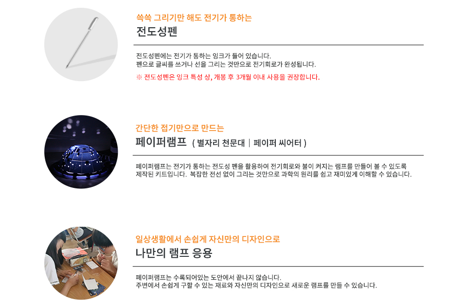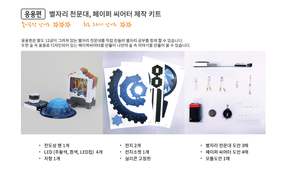 전도성펜을 통해 전기회로를 이해하고 창의공작활동을 할 수 있도록 제작되었습니다.