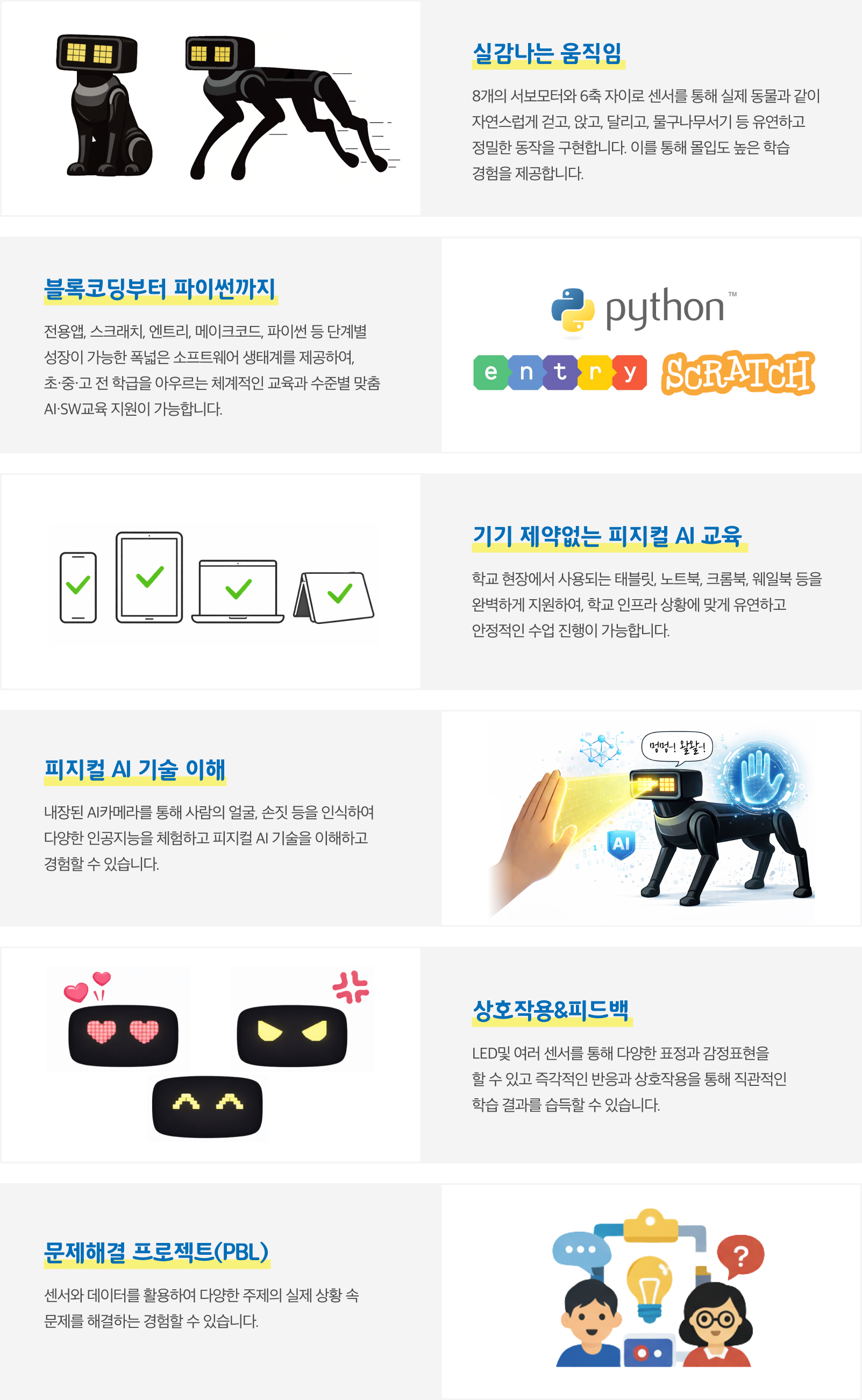 4족 보행 시스템과 AI학습기능을 갖춘 교육용 로봇으로,