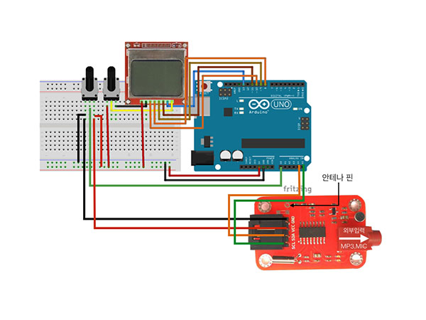 | 부품명 | 오렌지 보드 | 브레드보드 | 점퍼케이블 | 10kΩ 가변저항 | 노키아 5110 LCD |