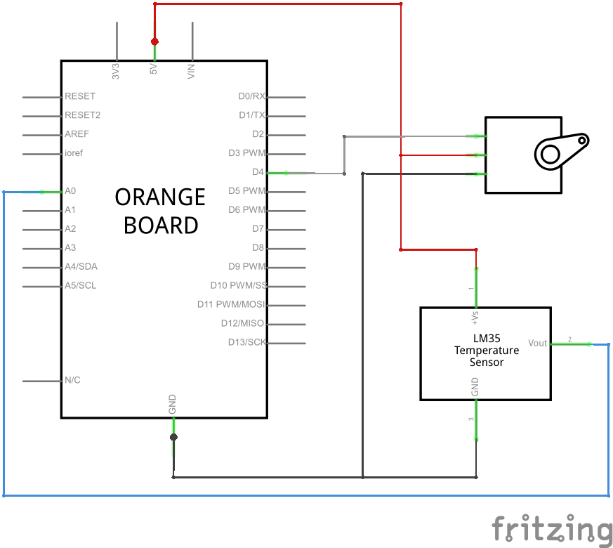 아날로그 온도센서가 측정한 값을 서보모터의 각도값으로 변환시켜 서보모터의 움직임을 통해 우리는 현재의 온도를 눈으로 볼 수 있습니다.